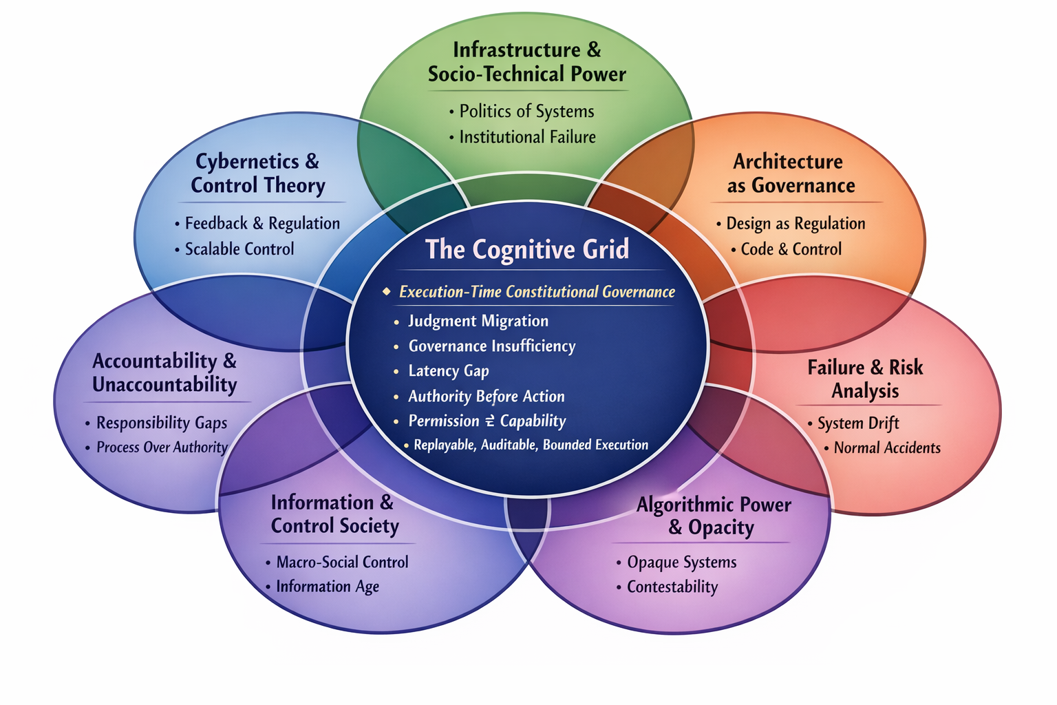 The book itself is a modest contribution to an established nonfiction canon on governing complex, tightly coupled systems. It borrows from cybernetics and control theory, the reliability-and-failure literature, and the accountability tradition that shows how outcomes are produced while responsibility diffuses. Its narrower claim is simply this: as machine-mediated judgment accelerates, permission must become executable—legible, bounded, and auditable—at the same execution-time scale.