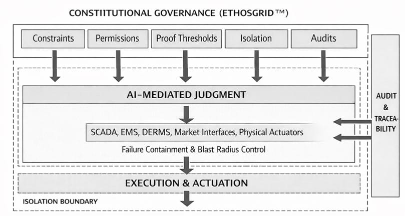 EthosGrid does not replace SCADA, EMS, DERMS, market platforms, or operator authority. It governs how AI-mediated judgment may inform those systems. It defines what kinds of recommendations may be generated, under what conditions they may be relied upon, and what evidence must be produced as a condition of use.