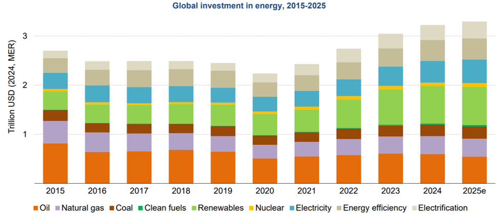 Global energy investment hits $3.3 trillion in 2025, with two-thirds ($2.2 trillion) now flowing to clean energy. The IEA warns that AI and data centers are reshaping demand, potentially consuming 1,000 TWh by 2030 and driving a new “Age of Electricity and Intelligence.”