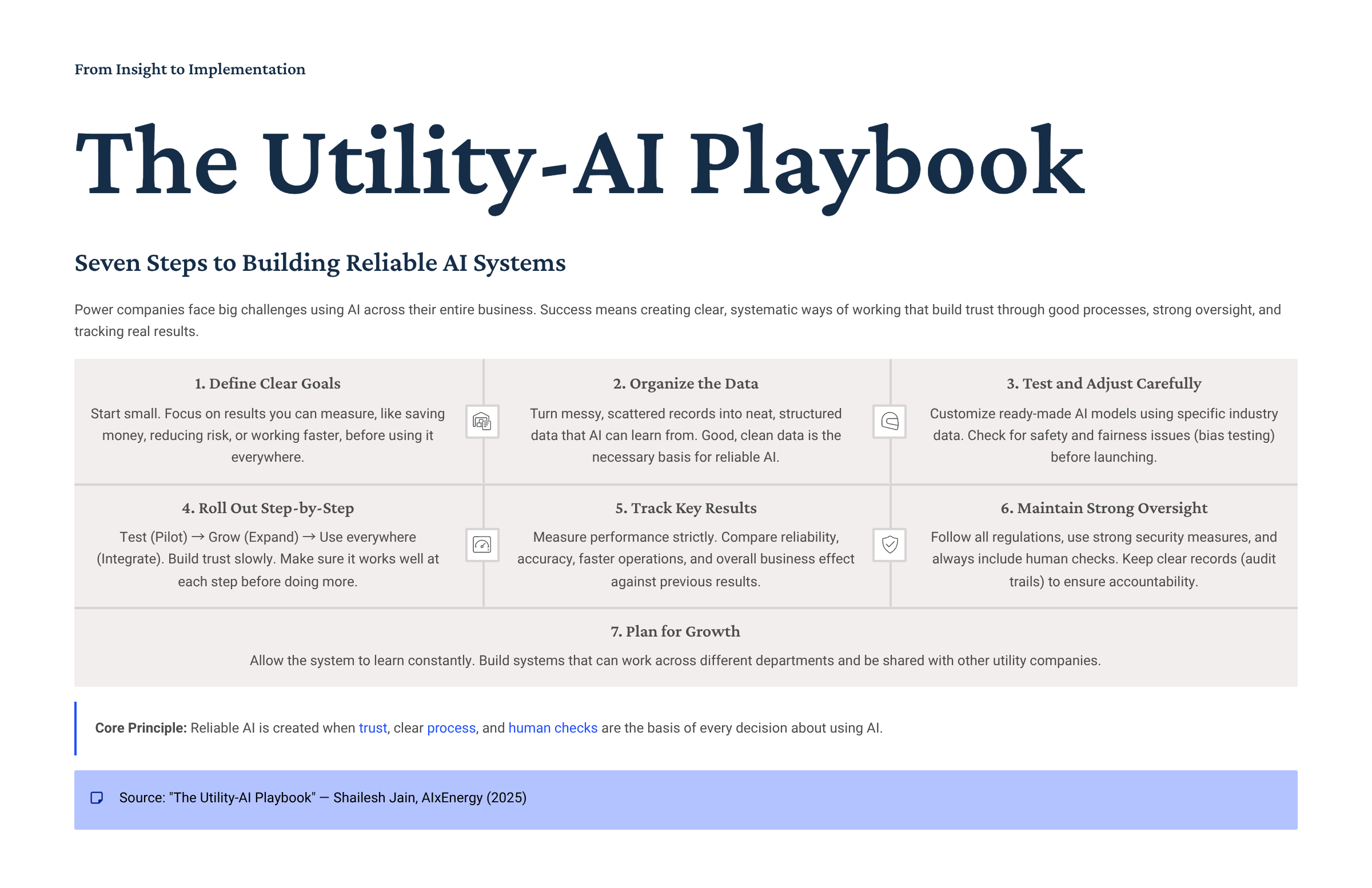 AI in utilities isn’t about replacing people—it’s about process, trust, and governance. The Utility-AI Playbook outlines seven steps to make intelligence utility-grade: start small, structure data, fine-tune, phase in, measure, govern, and evolve. Reliability remains human-led.